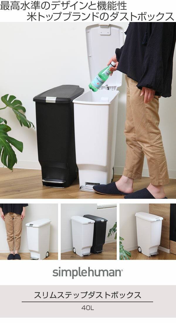 サイズ本体外寸:約 幅26×奥行49×高さ64本体内寸:約 幅22×奥行41×高さ60フタを開けた時の高さ:約 107.4(cm)重量:3200g内容量1個(容量:40L)材質本体:ABS樹脂・ポリプロピレン・ステンレススチールカラーホワイト、ブラック生産国台湾製備考1年間の保証付き※10年の保証書が入っていることがありますが、製品の保証は1年です商品区分ゴミ箱(フタあり)カテゴリから探す正規品 ゴミ箱 シンプルヒューマン simplehuman 40L スリムステップダストボックス ふた付き「日々の暮らしは新化する」アメリカでトップクラスのシェアを誇る、信頼のハウスウェアブランド「シンプルヒューマン」。