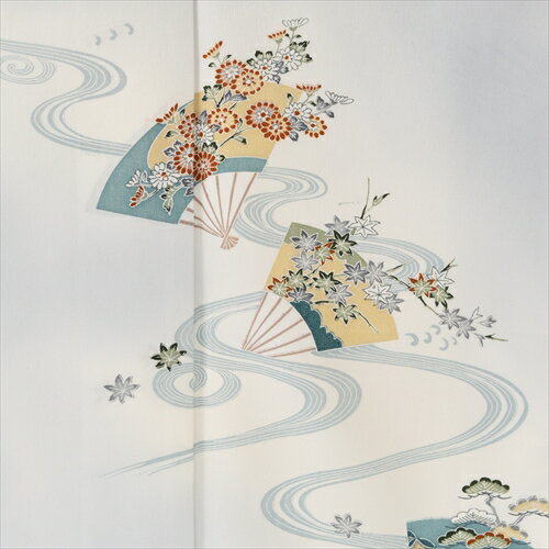 ■0532-39-7660 標準サイズ 身長・・・145cm〜155cm位 洋服サイズ・・・7号〜11号位まで 商品説明 ブルーグレー地に古典的な扇と流水が描かれ、和装小物等の挿し色で装いを楽しめるお着物です。