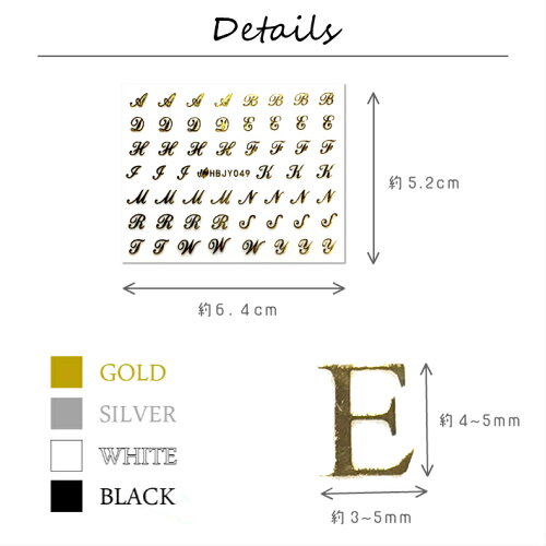 商品説明商品名ネイルシール アルファベット イニシャル 全8種 ブロック体 筆記体【ゴールド/シルバー/ホワイト/ブラック】3dシール商品内容[種類] 全8種[サイズ・容量]台紙サイズ:縦約52mm×横約64mm アルファベットサイズ:縦約4〜5mm×横約3〜5mm 切り離してご使用下さいませ。